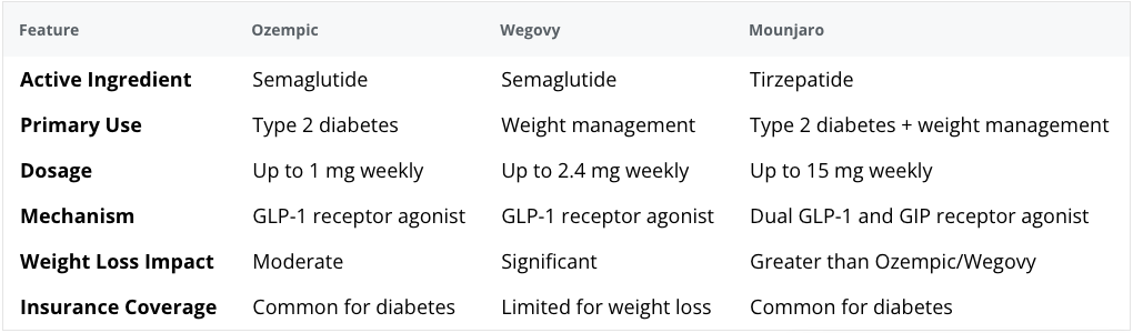 <strong>Key Features of Ozempic, Wegovy, and Mounjaro</strong>